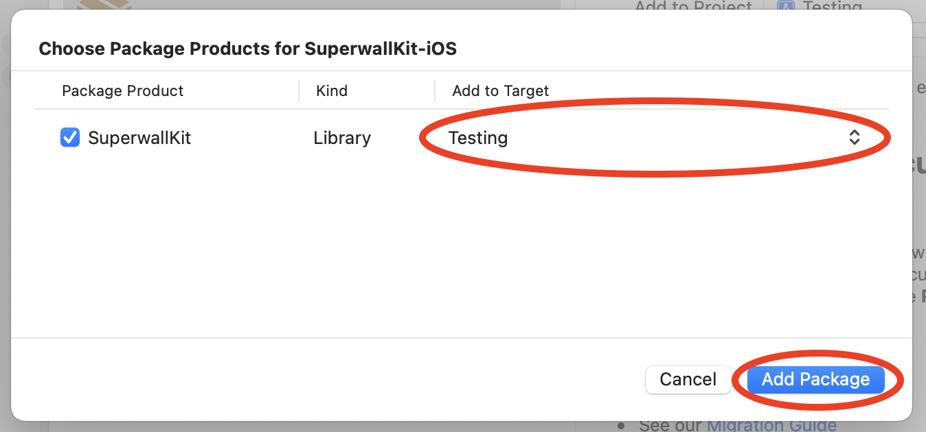 After the package has loaded, make sure Add to Target is set to your app's name and click Add Package: