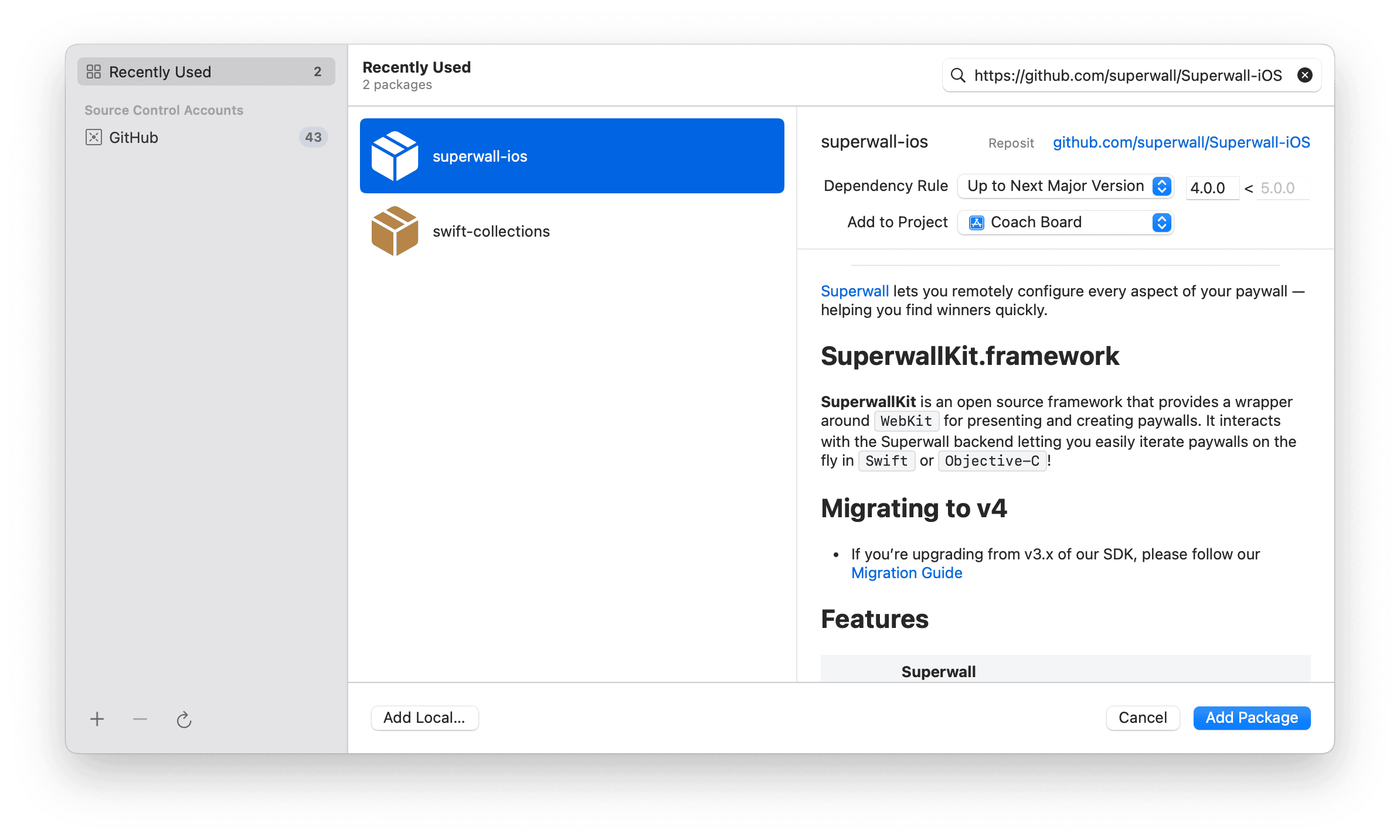 https://github.com/superwall/Superwall-iOSin the search bar. With the Superwall-iOS source selected, set the Dependency Rule to Up to Next Major Version with the lower bound set to 4.0.0. Make sure your project name is selected in Add to Project. Then click Add Package: