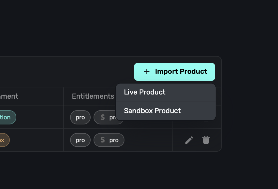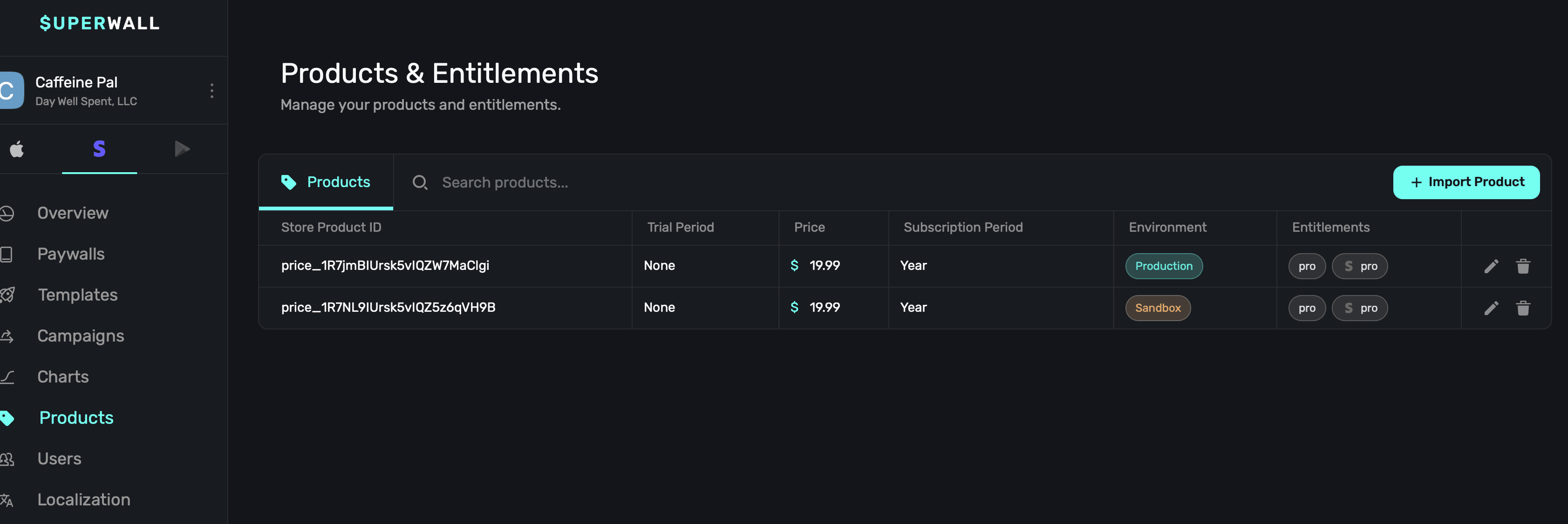 Once you've created a sandbox product in Stripe, import them to Superwall the same way as you would a normal product, and then they are ready for use in a paywall. Within the products page, Superwall will show which environment each product belongs to: